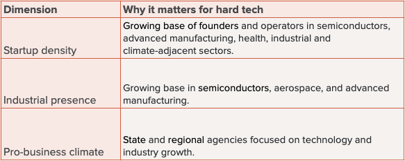 Taken together, Arizona offers an unusually strong fit for hard tech: a rising startup hub, a deep pipeline of engineering and scientific talent, concentration in advanced manufacturing and semiconductors, and a supportive policy and business environment.