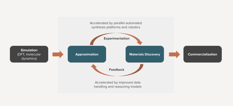 Figure 1. Today’s AI and automated synthesis platforms massively accelerates the time between approximation and materials discovery. It does not improve the accuracy or power of fundamental physics-based prediction tools, or the time to go from discovery to commercialization.